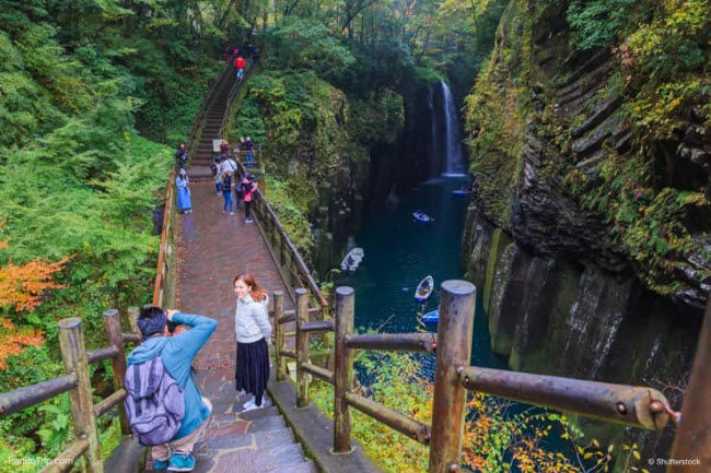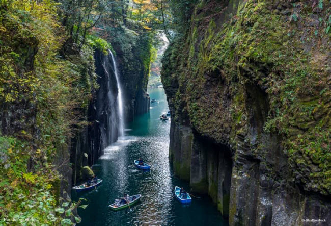 10. Hẻm núi Takachiho: Địa danh này thực sự là phiên bản sống của nghệ thuật Nhật Bản. Hẻm núi có vách đá bazan cao 100m trên mặt nước trong xanh của sông Gokase. Vách đá dựng đứng cùng với cây xanh và rêu, tạo ra không gian như trong truyện cổ tích.