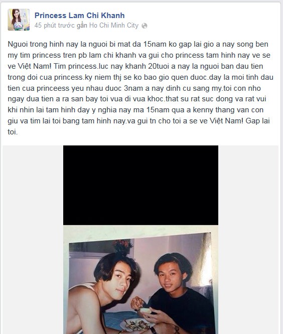 Vừa qua Lâm Khánh Chi đã để lộ ảnh thời chưa chuyển giới bên cạnh tình đầu. Khi đó Lâm Khánh Chi mới 14 tuổi ngồi bên cạnh mối tình đầu của mình. Cô đăng ảnh ngay trên trang cá nhân của mình mà không hề giấu diếm.
