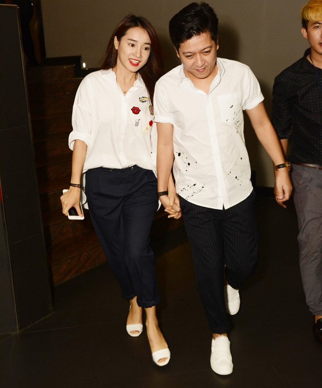 Vẫn set đồ quen thuộc gồm áo sơ mi trắng và chân váy, Nhã Phương thanh lịch hơn khi khoác thêm áo ngoài đồng điệu kẻ sọc trong lần đi sự kiện cùng danh hài Trường Giang.