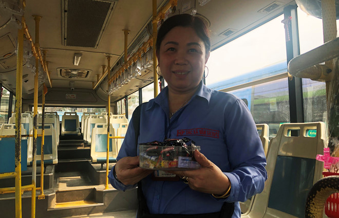 Trên xe, chị cũng bỏ tiền túi thủ sẵn những viên kẹo dành tặng cho những phụ nữ nhân ngày 8.3 khiến ai nấy đều giật mình cảm động.