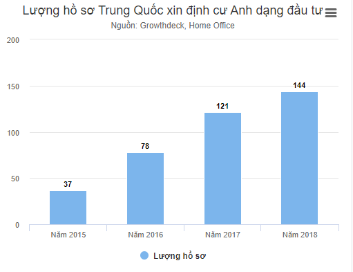 Lượng hồ sơ xin định cư sang Anh theo dạng đầu tư Tier 1 đến từ Trung Quốc đã tăng 19%, lên 144 hồ sơ, vào năm 2018 so với năm trước đó. Đây là dữ liệu được Growthdeck thu thập từ cơ quan phụ trách về nhập cư Home Office của chính phủ nước này. Nếu tính từ năm 2016, khi Anh bỏ phiếu quyết định rời khỏi EU, số người nộp đơn đã tăng gấp đôi.