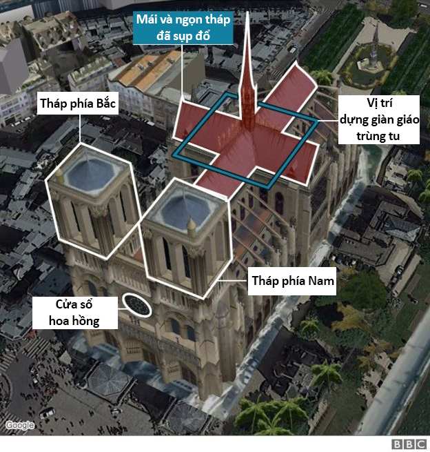 BBC mô phỏng phần bị cháy của Nhà thờ Đức Bà Paris.