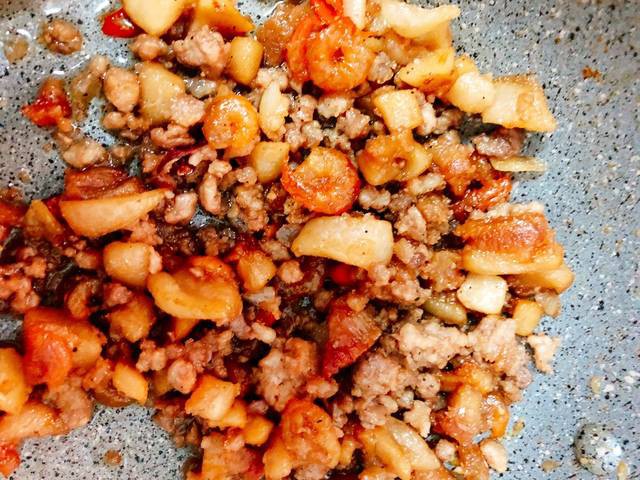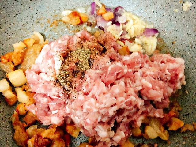 Làm nóng chảo, cho mỡ vào phi hành tỏi dậy mùi, cho thêm tóp mỡ vào rồi thêm thịt xay và các gia vị: tiêu, mắm, đường. Trộn đều nấu tiếp, cho thêm ớt.
