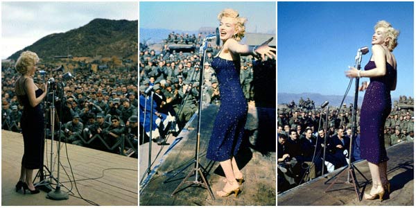 Năm 1954, Marilyn có buổi trình diễn nằm trong khuôn khổ chuyến viếng thăm lực lượng quân đội Hoa Kỳ đang đóng tại Hàn Quốc. Yêu kiều trong chiếc đầm ôm màu xanh lấp lánh như ánh sao trời, Monroe đã hớp hồn bao con tim, làm lãng mạn không gian vốn chỉ ngập mùi súng đạn và trở thành hình ảnh đẹp nhất của năm.