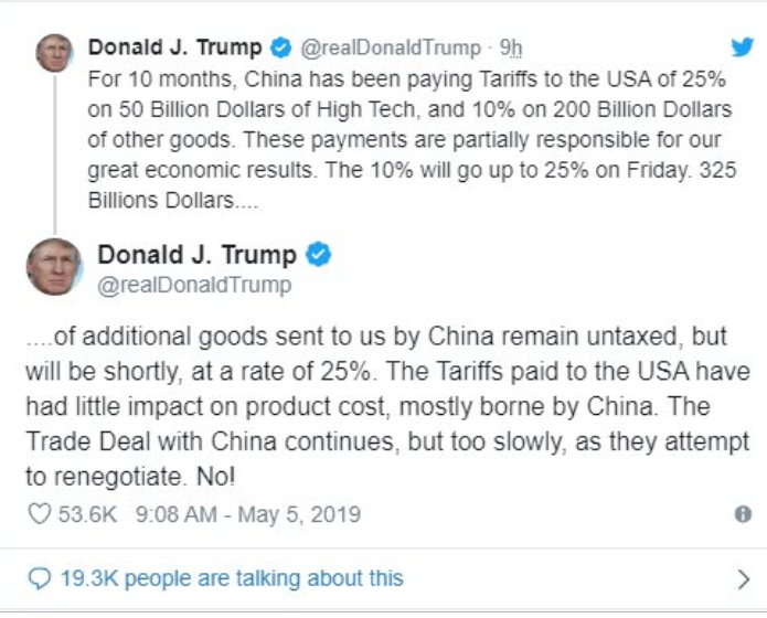 Đối với lô hàng trị giá 325 tỉ đô la vừa được xuất khẩu sang Mỹ, hiện giờ vẫn chưa được đánh thuế nhưng trong tương lai, sẽ được áp một khoản thuế trừng phạt 25%. Cuộc đàm phán thương mại diễn tiến quá chậm chạp bởi vì phía Trung Quốc đòi thỏa thuận lại. Câu trả lời là không!”.