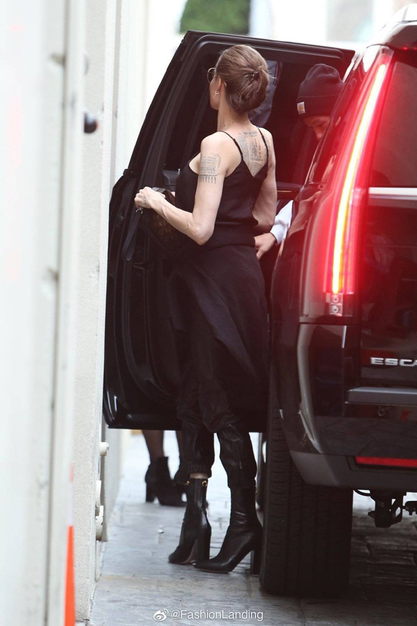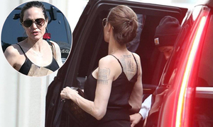 Nữ diễn viên Angelina Jolie mặc áo hai dây, búi tóc cao, để lộ những hình xăm lớn trên lưng, khi nữ minh tinh ăn vận đơn giản, tất bật đưa các con đi mua sắm dịp cuối tuần nhưng nụ cười luôn nở trên môi, trong lúc Angelina Jolie cùng các con trong trung tâm thương mại ở Beverly Hills.