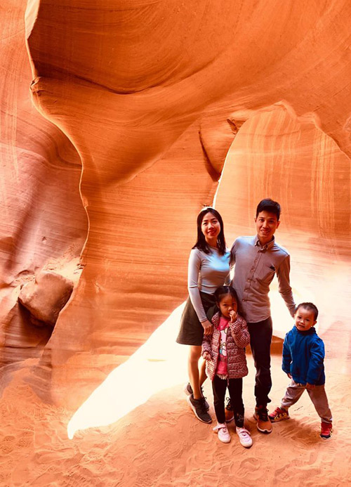 Trong số vô vàn những nơi đã đi qua, gia đình anh Trà - chị Yến ấn tượng nhất với hẻm núi Linh Dương Antelope Canyon - nơi du khách có thể đi xuống lòng đất và ngỡ ngàng trước kỳ quan của những mỏm đá được thiên nhiên tạo nên những hình thù như hình 2 con sư tử, người phụ nữ gió mà trước đây mới chỉ nhìn thấy trên wallpaper của Microsoft.