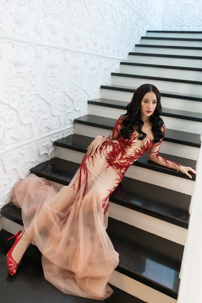 Trong khi đó, Chi Pu diện đầm dạ hội xuyên thấu khoe đường cong mềm mại.