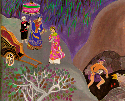 Quả nhiên, về sau Thạch Bà thụ thai, nhưng ba năm chưa đẻ. Giữa lúc đó, Thạch Ông mất, Thạch Bà sinh hạ một đứa con trai khôi ngô tuấn tú, đặt tên là Thạch Sanh..."