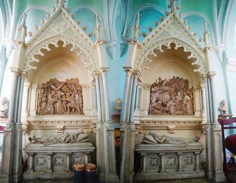 Hai pho tượng ông bà Huyện Sỹ trên hai ngôi mộ.