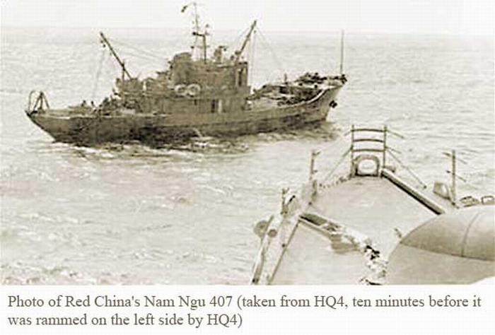Ngày 19 tháng Giêng 1974, Hải Quân Trung Cộng tiến chiếm Hoàng Sa. Sau trận hải chiến khoảng một giờ, Trung Cộng chiếm Hoàng Sa. Phía Trung Cộng công bố họ chỉ có 18 binh sĩ thiệt mạng và không có tàu nào chìm mặc dù báo chí Tây Phương cho rằng ít nhất một chiến hạm của hải quân Trung Cộng đã bị bắn chìm. Người viết không trình bày chi tiết ở đây vì diễn biến của hải chiến Hoàng Sa đã được rất nhiều tài liệu và nghiên cứu Việt Nam cũng như quốc tế công bố. Rất nhiều thông tin quý giá đang được lưu trữ tại website hqvnch.org.