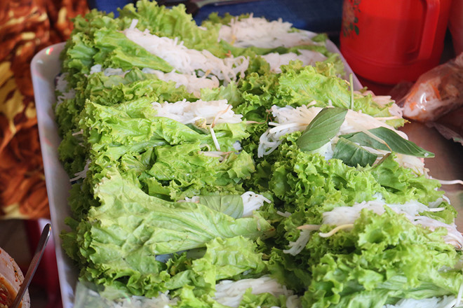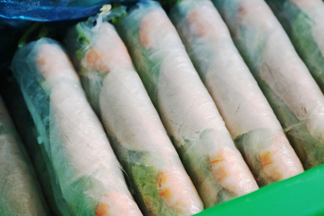 Bà Phương và hai đứa cháu gái tay cứ thoăn thoắt cuốn gỏi. Đầy khay này bà lại chuyển sang khay khác. Tôi thầm nghĩ cuốn nhiều thế này bán sao hết. Ấy thế mà trong tích tắc, mấy khay gỏi cuốn trống trơn, áng chừng cũng gần 500 cuốn.