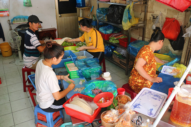 “Người ta gọi là phải có liền, ví như đặt 100 cuốn là phải có 100 cuốn đem đi liền chứ người ta không có đợi mình đâu”, ông Cường hào hứng kể. Ông Cường vừa phụ vợ cuốn gỏi vừa là chân giao hàng cho quán.