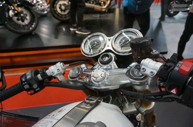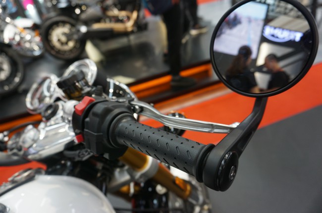 Gương chiếu hậu được gắn ở đầu thanh tay lái. Là dòng xe mang chất cafe racer nên thanh tay lái của Thruxton R được thiết kế thẳng.