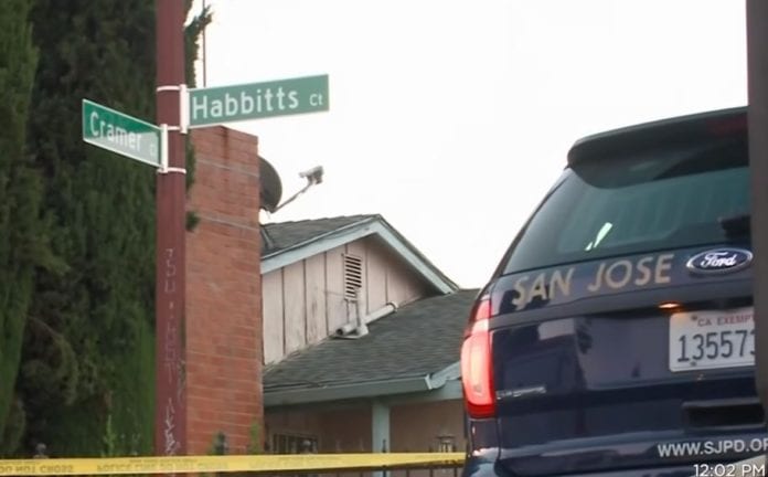 Một xe cảnh sát San Jose đậu trên đường Habbitts, nơi có căn nhà xảy ra án mạng mà ông Chi bắn chết bốn người trước khi tự sát. (Hình chụp từ màn hình CBS News)