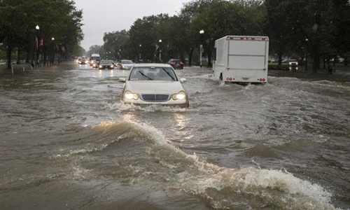 Mưa lớn làm ngập giao lộ của Đường 15 và Đại lộ Constitution ở Washington D.C. hôm 8/7. Ảnh: NYTimes.
