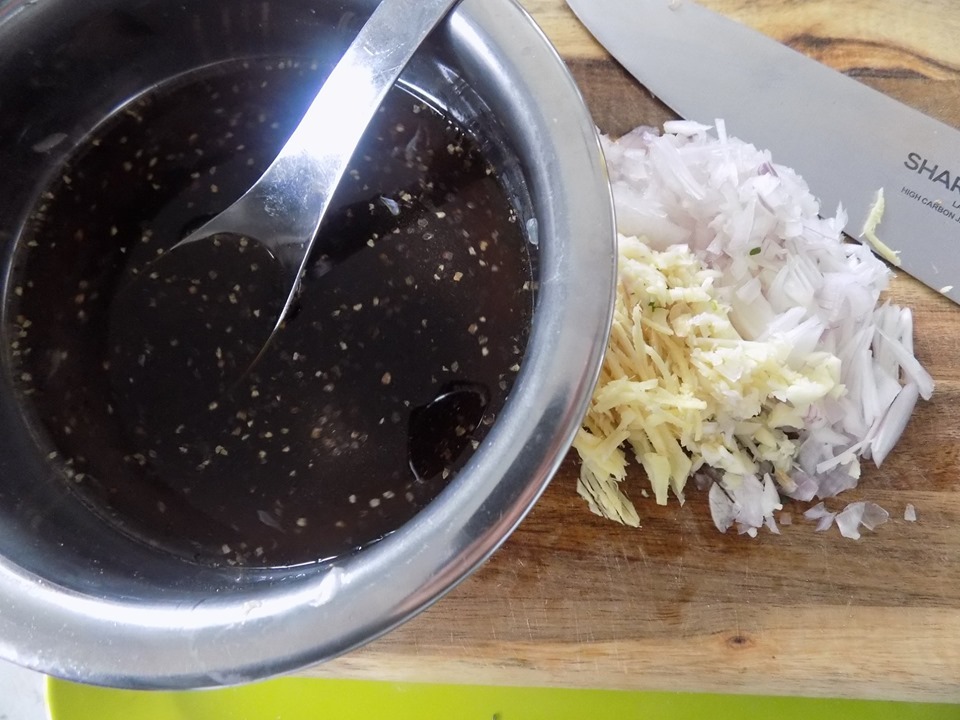Gia vị: 2,5 muỗng canh đường + 4 muỗng canh nước mắm + 1/2 muỗng cà phê tiêu + 2 muỗng canh nước hòa sẵn trong 1 cái chén.