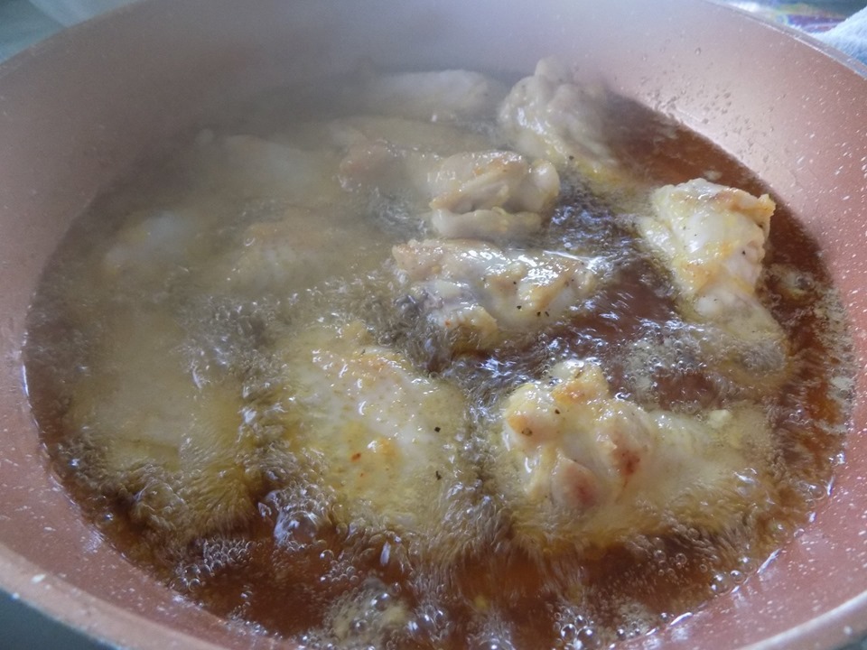 Bước 3: Bắc chảo lên bếp, cho vào khoảng 100 ml dầu, chờ dầu nóng bạn cho cánh gà vào chiên với lửa hơi thấp. Khi cánh gà chín vàng thì gắp ra dĩa.