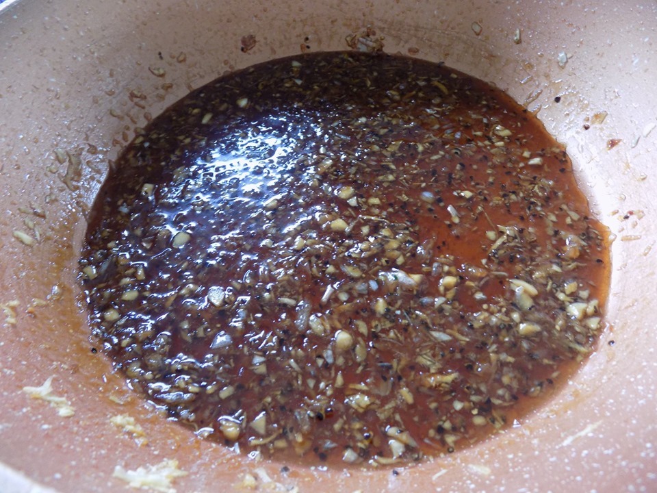Bước 4: Bắt 1 cái chảo khác lên bếp, cho vào 1 muỗng canh dầu, chờ dầu nóng thì cho hết hành, tỏi và gừng vào xào thơm, sau đó cho hết phần gia vị đã pha sẵn vào nấu lửa nhỏ khoảng 3-4 phút.