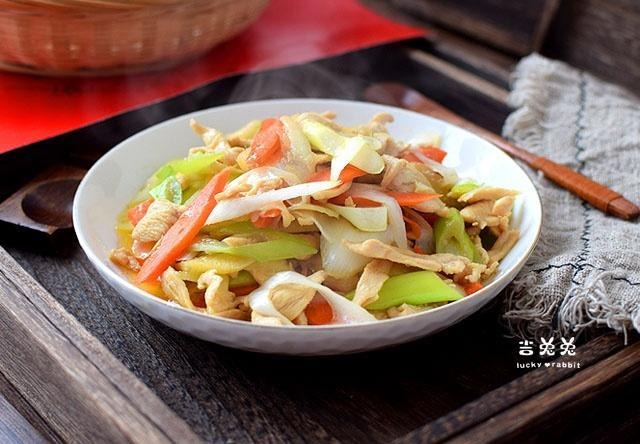 Hành lá rửa sạch, cắt khúc, cà rốt gọt vỏ, thái lát monđể sẵn, ức gà thái thành miếng nhỏ. Làm nóng chảo dầu, cho gừng và tỏi băm nhỏ vào, cho ức gà vào xào trước đến khi chín hẳn thì đổ một chút giấm, rượu nấu ăn, đảo đều. Tiếp tục cho cà rốt, hành lá vào, thêm gia vị vừa miệng, đảo lại lần cuối rồi dọn ra đĩa.