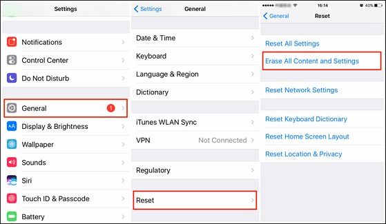 Việc khôi phục cài đặt gốc sẽ xóa tất cả dữ liệu trên iPhone, do đó bạn nên sao lưu lại toàn bộ dữ liệu bằng iTunes hoặc iCloud trước khi thực hiện. Đầu tiên, bạn hãy truy cập vào Settings (cài đặt) > General (cài đặt chung) > Reset (đặt lại) > Erase all contents and settings (xóa tất cả nội dung và cài đặt), nhập lại mật khẩu khi được yêu cầu và chờ một lát cho đến khi mọi thứ hoàn tất.
