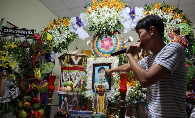 10 giờ tối 25.8, chiếc taxi chở Thiên Ân từ sân bay Tân Sơn Nhất về đến trước ngõ nhà D. Không cổng hoa, không mâm quả, Ân nhận bó hoa cưới từ tay bạn rồi cầm micro. Anh nhờ bạn mở giúp beat bài hát đầu tiên, vừa hát vừa đi vào trước di ảnh và quan tài của vợ.
