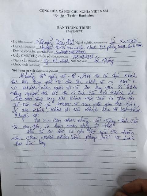 Theo bản tường trình, anh Đạt thừa nhận có chở vị khách nói trên nhưng chỉ nhận 150 ngàn đồng tiền cước chứ không nhận 1,2 triệu như phản ánh.