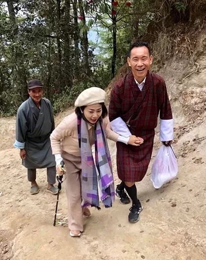 Mai Phương được hướng dẫn viên du lịch dìu lên tu viện Tiger's Nest ở Bhutan. Ảnh: MP.