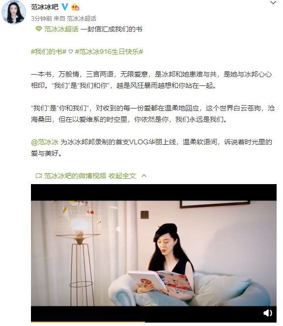 Nhân dịp sinh nhật lần thứ 38, Phạm Băng Băng đã đặc biệt quay một video để gởi lời cảm ơn sự yêu thương cũng như ủng hộ của các fan hâm mộ dành cho cô. Đây cũng là vlog đầu tiên của Phạm Băng Băng, đoạn video dài 8 phút, Phạm Băng Băng luôn xuất hiện trong ống kính, ngôn từ vô cùng mượt mà, có thể thấy những lời này đều là những lời thật lòng từ nội tâm của cô.