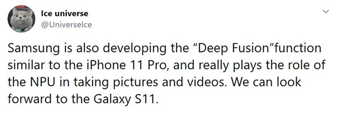 Giờ đây, IceUniverse tiếp tục đưa ra một tweet mới giải thích về những gì ông đã nói trong tháng 8. Theo đó, Samsung đang phát triển một cái gì đó tương tự như tính năng Deep Fusion mà Apple giới thiệu cho hệ thống camera trên iPhone 2019.