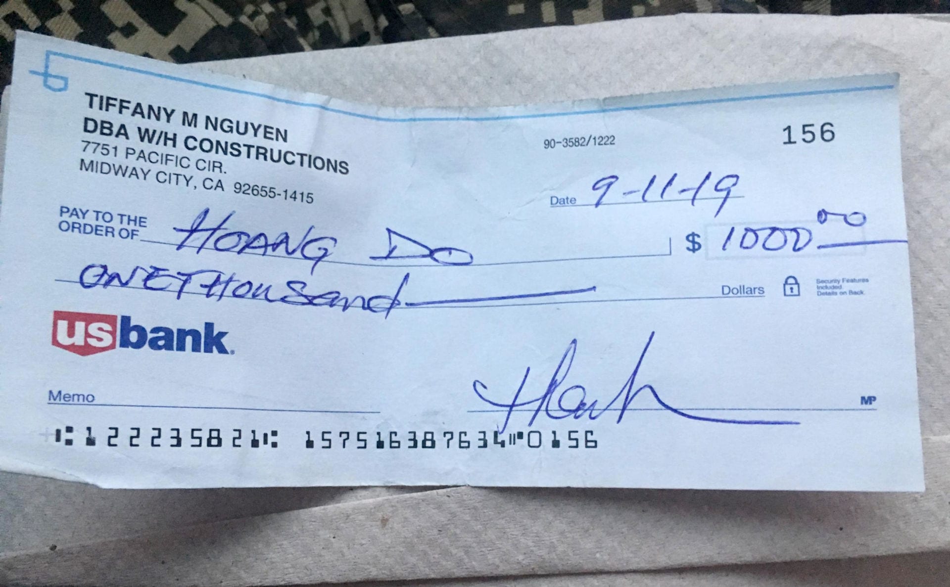 Tấm “check” mà ông Điền đưa cho ông Ly By, cũng giống tấm “check” đã đưa cho anh Hoàng Đỗ, trong đó tên người chủ “check” là Tiffany M Nguyen và DBA W/H Constructions với địa chỉ căn nhà đã được nhắc ở trên.