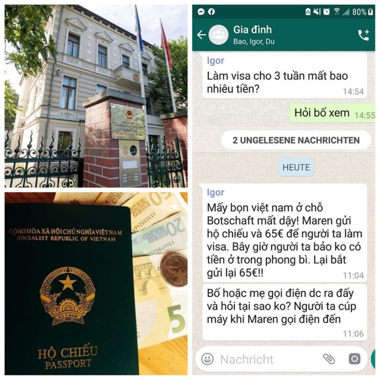Vụ việc mới vừa xảy ra trong tuần này (cuối tháng 9/2019), bạn gái Đức của một chàng trai Việt đã phải gửi tiền 2 lần cho Đại sứ quán Việt Nam (ĐSQ) ở Berlin để làm Visa du lịch 3 tuần tới Việt Nam.