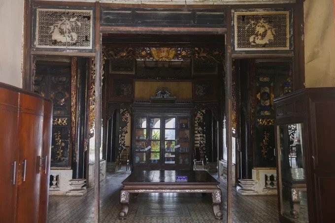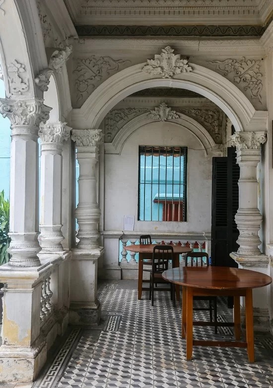 Hành lang căn nhà với cách xây dựng, lối kiến trúc đặc trưng như một biệt thự kiểu Pháp. Phần sàn được làm trũng về phía trung tâm theo phong thủy của người Hoa, với ý nghĩa “nước chảy về chỗ trũng”, tiền bạc sẽ đổ về nhà.