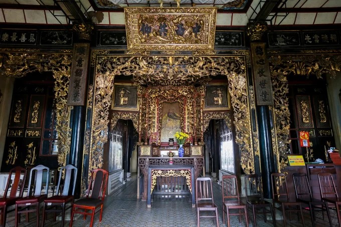 Căn nhà có ba gian mang nét đặc trưng kiến trúc miền Nam, với cánh cửa, cột nhà, bàn thờ... sơn son thếp vàng, chạm trổ loan phượng. Chính giữa căn nhà là tượng thờ Quan Công, một vị tướng thời Tam Quốc.