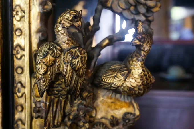 Những trạm trổ rồng phượng, chim công, mai, lan, cúc, trúc... tinh xảo theo văn hóa phương Đông nổi bật ở phòng khách. Màu vàng thể hiện cho sự quyền quý của chủ nhân căn nhà.