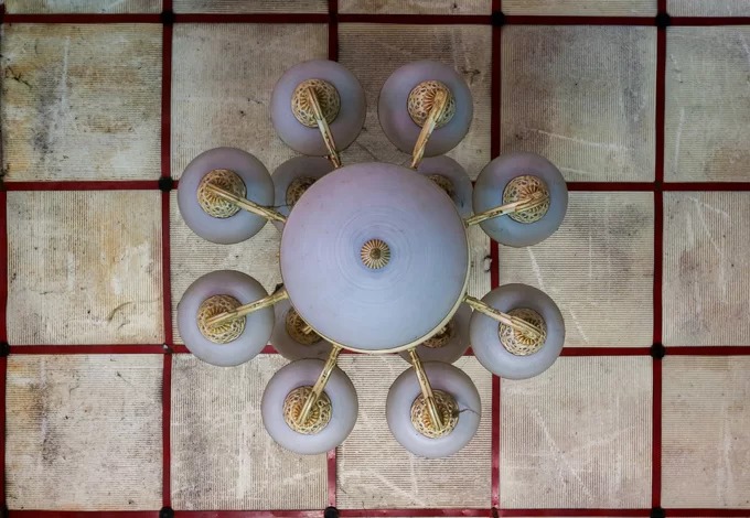 Những đồ dùng trong nhà như bàn ghế, đồ thờ, đồng hồ, gương... vẫn nguyên vẹn. Trên trần phòng khách là chiếc đèn chùm kiểu Pháp.
