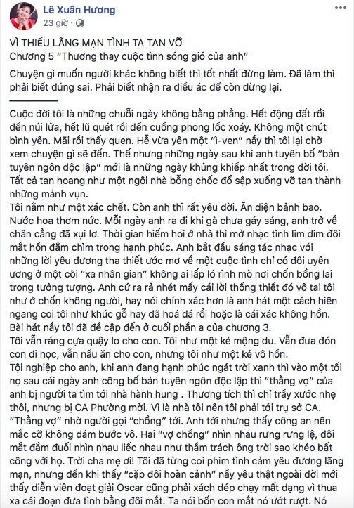 Đối lập với sự thờ ơ của Thanh Bạch, mới đây trên trang cá nhân, nghệ sĩ Xuân Hương tiếp tục chia sẻ chuyện “thâm cung bí sử” về cuộc hôn nhân với nam MC. Cô viết: “Cuộc đời tôi là những chuỗi ngày không bằng phẳng. Hết động đất rồi đến núi lửa, hết lũ quét rồi đến cuồng phong lốc xoáy. Không một chút bình yên. Mãi rồi thấy quen. Hễ vừa yên một “ì-ven” nầy thì tôi lại chờ xem chuyện gì sẽ đến. Thế nhưng những ngày sau khi anh tuyên bố “bản tuyên ngôn độc lập” mới là những ngày khủng khiếp nhất trong đời tôi. Tất cả tan hoang như một ngôi nhà bỗng chốc đổ sập xuống vỡ tan thành những mảnh vụn. Tôi nằm như một xác chết. Còn anh thì rất yêu đời…”.