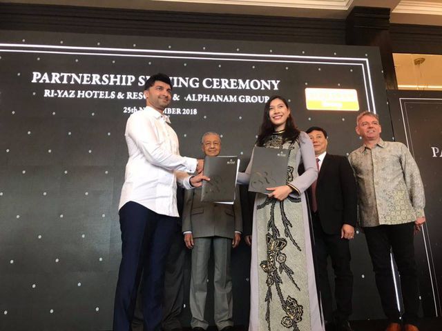 Nguyễn Ngọc Mỹ cùng đại diện của Ri-Yaz Hotels & Resorts ký kết hợp tác dưới sự chứng kiến của Thủ tướng Malaysia tháng 11/2018"