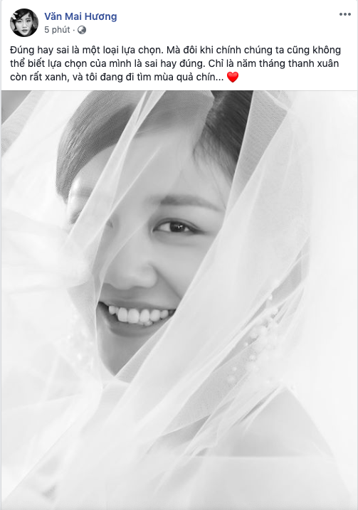 Đi kèm hình ảnh gây hoang mang dư luận, nữ ca sĩ viết: "Đúng hay sai là một loại lựa chọn. Mà đôi khi chính chúng ta cũng không thể biết lựa chọn của mình là sai hay đúng. Chỉ là năm tháng thanh xuân còn rất xanh, và tôi đang đi tìm mùa quả chín".