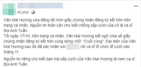 Trước đó không lâu, Văn Mai Hương bất ngờ công khai giấy chứng nhận đăng ký kết hôn cùng dòng chữ: "Cuối cùng" trên instagram cá nhân. Theo đó mọi thông tin trong giấy đều trùng khớp với nữ ca sĩ. Tuy nhiên, ngay sau khi hình ảnh giấy đăng ký kết hôn của nữ ca sĩ Văn Mai Hương được đăng tải, lập tức trên mạng xã hội xuất hiện thông tin người sẽ kết hôn với cô chính là Bùi Anh Tuấn.
