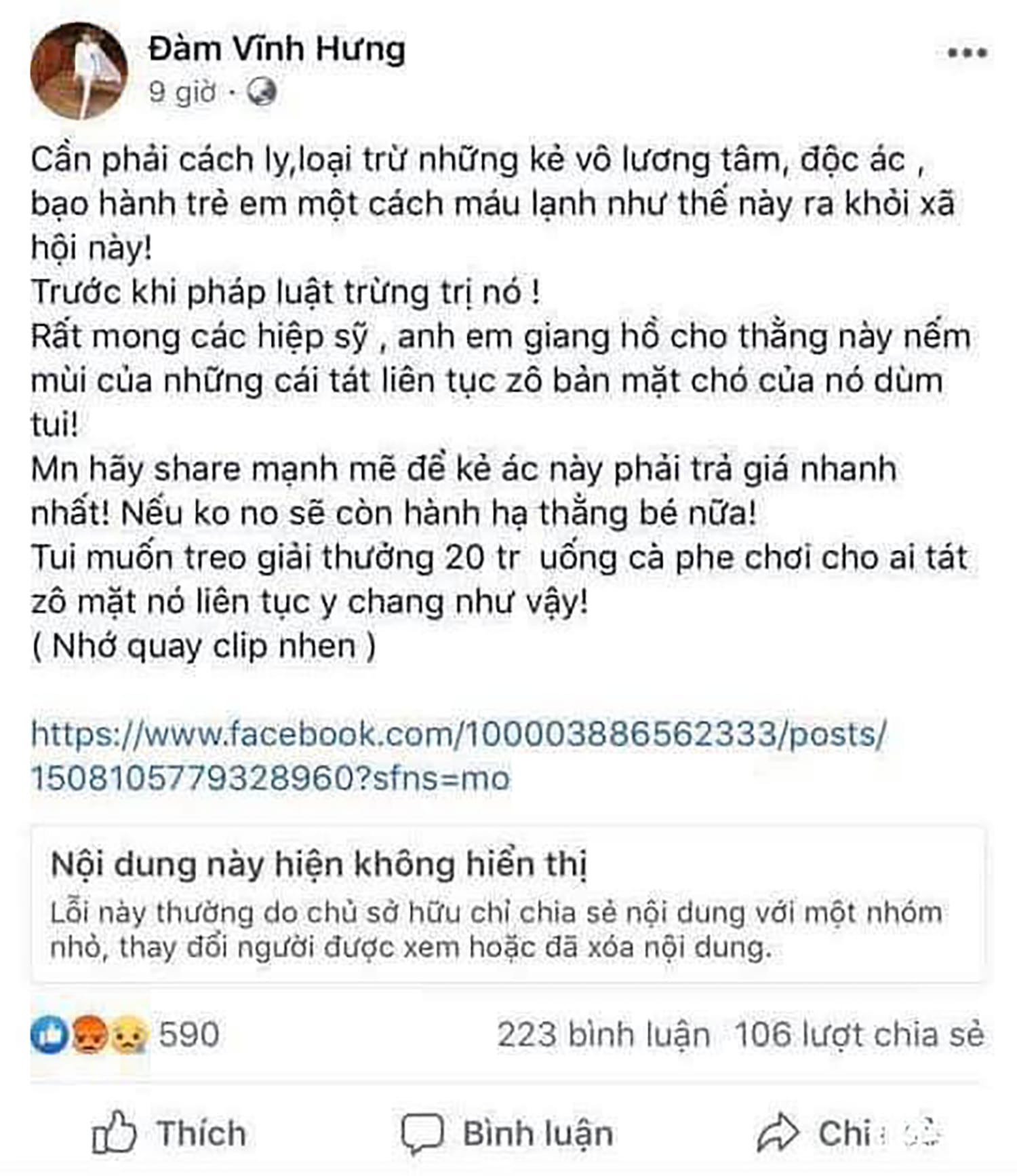 Cụ thể, báo Tuổi Trẻ dẫn chứng, hôm 17 Tháng Mười, trang cá nhân được cho là của Đàm Vĩnh Hưng đăng tải lời kêu gọi: “Cần phải cách ly, loại trừ những kẻ vô lương tâm, độc ác, bạo hành trẻ em một cách máu lạnh như thế này ra khỏi xã hội trước khi pháp luật trừng trị nó. Tôi muốn treo thưởng 20 triệu đồng ($864) uống cà phê chơi cho ai tát vô mặt nó liên tục y chang như vậy.”