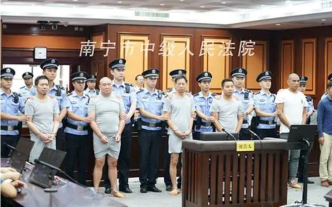 Các bị cáo tại Tòa án Nhân dân Trung cấp Nam Ninh. Ảnh chụp màn hình/Telegraph.
