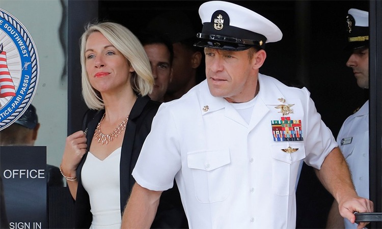 Edward Gallagher cùng vợ Andrea Gallagher rời tòa án tại căn cứ hải quân San Diego sau phiên xét xử ngày 7/2. Ảnh: Reuters.