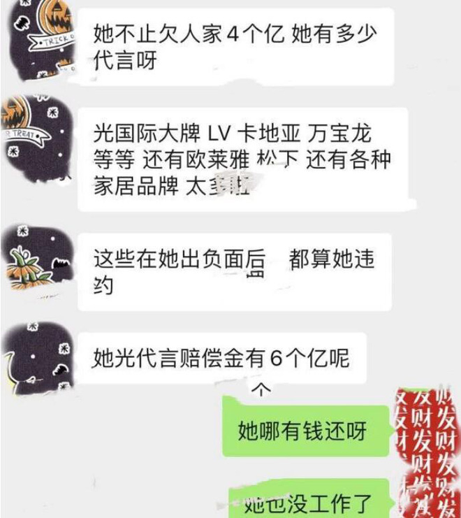 Theo đó, hình ảnh một đoạn chat giữa hai nhân vật hiện chưa rõ danh tính đang trao đổi với nhau về sự việc liên quan tới tình hình của Phạm Băng Băng. Trong đoạn hội thoại, nàng "Kim Tỏa” vướng vào khoản nợ lên đến 600 triệu NDT (khoảng 2.100 tỷ đồng). Đây là tổng số tiền cô phải bồi thường cho cho các thương hiệu cao cấp đang làm đại diện như Louis Vuitton, Cartier, Montblanc, L'Oreal và rất nhiều thương hiệu khác. Khi biết thông tin đó, người còn lại trong đoạn chat liền băn khoăn hỏi lại “Cô ấy làm gì có tiền, bây giờ cô ấy còn không làm việc cơ mà”.
