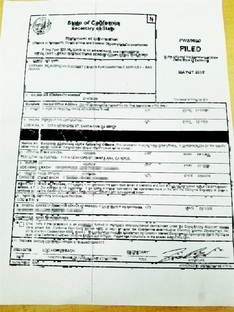 Chứng từ cho biết chùa Bảo Quang là một công hội tôn giáo và từ thiện bất vụ lợi (A Non-Profit Religious and Charitable Corporation) với tên gọi đầy đủ là Vietnamese-American Center for Buddhism and Charitable Services – Bao Quang từ năm 1990. (Hình: Ngọc Lan/Người Việt)