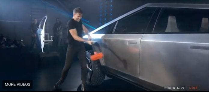 Dùng búa đập vào xe Tesla pickup truck điện để kiểm tra độ cứng. (Hình chụp màn hinh YouTube Tesla)