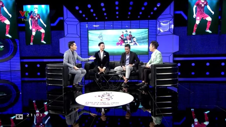 Quốc Khánh (ngoài cùng bên trái) làm MC bình luận sau trận đấu