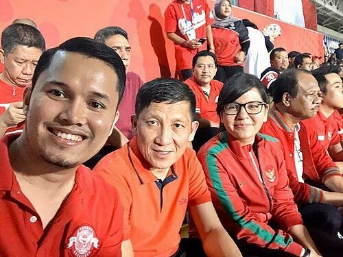 Nero Leo Adriani (ngoài cùng bên trái) chụp ảnh cùng những quan chức của Liên đoàn Bóng đá Indonesia. Ảnh: NVCC.