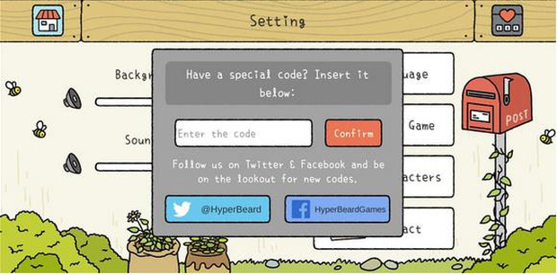 Sau đó, bạn sẽ thấy được bảng nhập code của Adorable Home, hãy nhấn vào link Twitter và Facebook của HyperBeard.