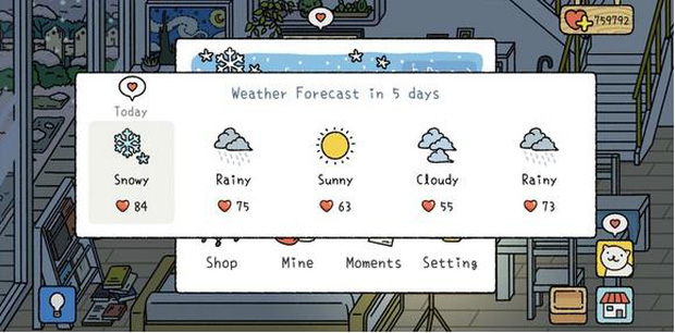 Cũng vì vậy mà khi người bạn đời rời khỏi nhà thì bạn nên thực hiện một số thay đổi cho những vật dụng trong nhà để phù hợp với thời tiết của ngày hôm đó. Để có thể biết thời tiết hôm đó nắng hay mưa thì bạn hãy bấm vào biểu tượng Adorable Home, chọn biểu tượng thời tiết ở trên cùng thì bạn sẽ biết được thời tiết trong 5 ngày tới.